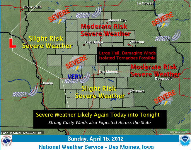 The National Weather Service Reports that a strong low pressure system will move into northeastern Nebraska by mid day, with additional thunderstorm development expected today into tonight. Severe weather is likely across much of the state, with the greatest threat of severe weather occurring this afternoon into the evening hours. In addition to the severe weather threat, very windy conditions are expected as gusty winds aloft mix down to the surface. Southerly to southwesterly winds of 25 to 40 mph with gusts to 50 to 60 mph will be possible across portions of the state this afternoon into this evening. Northwest winds of 25 to 35 mph with gusts to 50 mph will be possible late tonight into early Monday morning across northern Iowa.