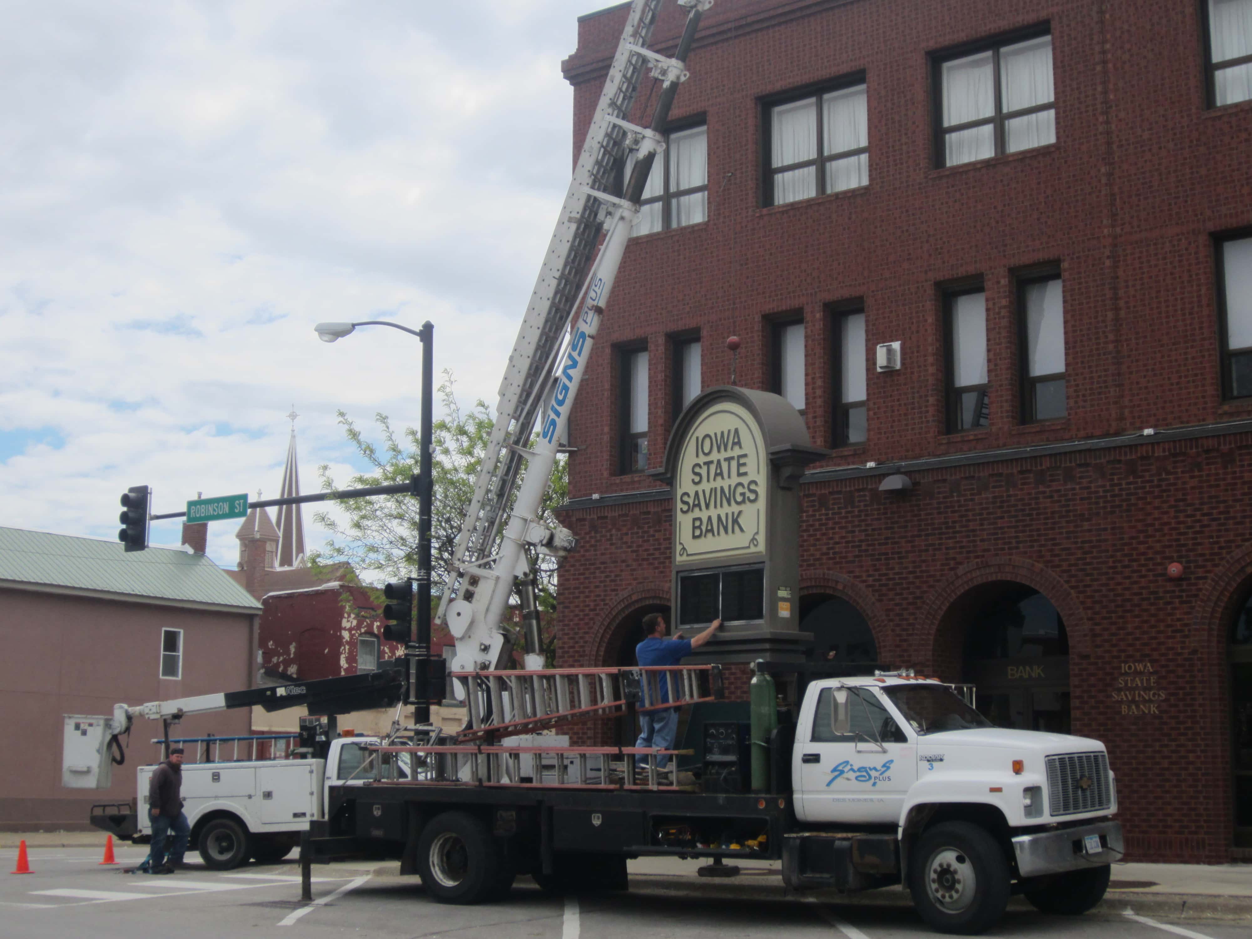 If you are wondering what has happened to the Iowa State Savings Bank sign in downtown Knoxville, it’s been taken down for restoration. David Hoke, Executive Vice President for Marketing for the bank, tells KNIA/KRLS News that the sign has been shipped to Des Moines for the upgrade. The original ornate frame will be retained, and the electronics will be replaced with more energy efficient LED technology. Hoke says that his research into the history of the sign indicates that it was first installed in approximately 1972.