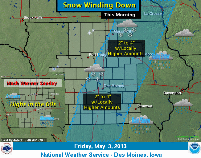 The Marion County Sheriff’s Office reports that roads are up to 100% snow and slush covered. County and state plows are in operation. There are reports of numerous vehicles in ditches. The Marion County Secondary Road Department tells KNIA/KRLS that bridges are particularly slick this morning. The National Weather Service tells KNIA/KRLS News that this is the first measurable amount of snow to ever be recorded during Tulip Time. The last measurable amount of snow in Pella during the first week of May was in 1907. National Weather Service records indicate Knoxville had an inch of snow in early May in 1994. This is only the third time in history that we’ve received at least an inch of snow in May.