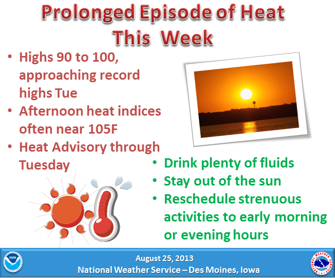 A late summer heat wave is upon us. Highs are expected to be in the mid-to-upper 90s throughout the week. Judi Van Hulzen, with Marion County Public Health, says that dehydration can be a major factor in this weather. If you’re out doing work or playing in the sun, Van Hulzen says to be sure to take breaks and get in the shade. She suggests that you either drink water or something with electrolytes like Gatorade or fruit juices to keep you hydrated. She says leg cramps and confusion are signs of dehydration. If any of those symptoms don’t improve after you get into the shade, she says it’s time to go to the doctor to prevent heat stroke. The Knoxville School District has announced they’ll be letting out 90 minutes early Monday-Wednesday because of the heat.