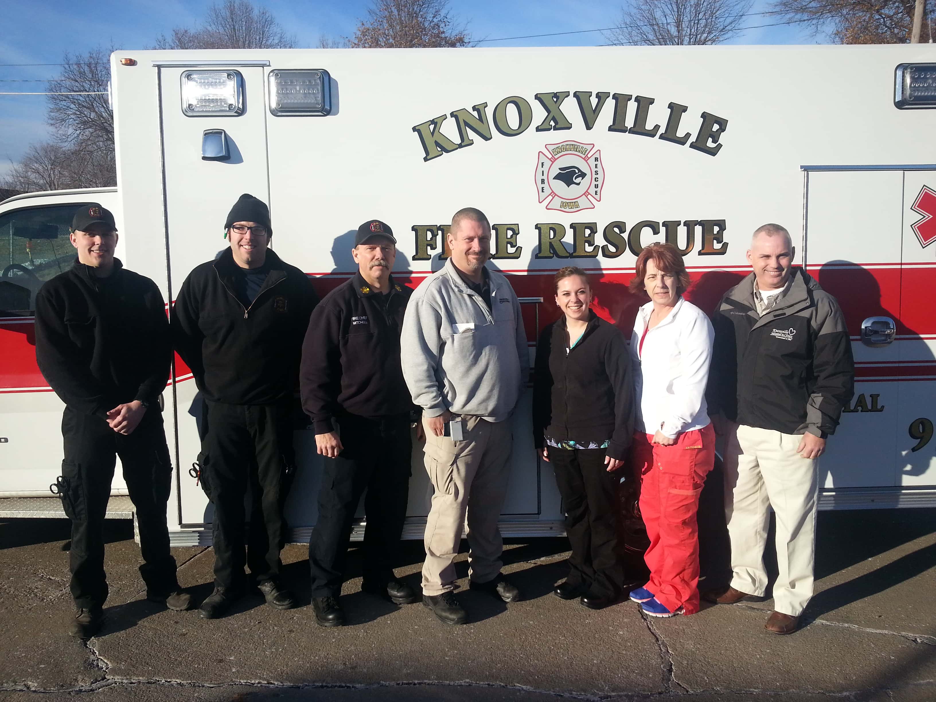 In a ground-breaking venture that KNIA KRLS News told you about recently, Knoxville Hospital and Clinics and Marion County Emergency Management have partnered to create an Emergency Response Training Initiative. This program has caught the attention of the Iowa Hospital Association. Representatives of the IHA have talked to hospital officials, and want to highlight the program in an article to their statewide audience. Members of Knoxville Fire and Rescue were at the facility Wednesday afternoon, with an ambulance, to show their support for for the new program. The IHA asked for photos of representatives of the program for their publication.