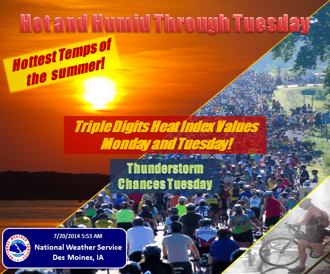 The National Weather Service reports that the hottest temperatures of the summer will build into the state today and tomorrow with highs rising well into the 90s across central Iowa both days. The hottest day of the two looks to be Tuesday when heat index values of 105 to 110 degrees over central to southern Iowa can be expected. Northern Iowa will see triple digits heat index readings both Monday and Tuesday afternoon. A Heat Advisory is in effect until 7PM Tuesday. Chances of thunderstorms are forecast Tuesday late afternoon into the evening hours with a low potential for severe weather. Cooler weather is in store for Wednesday through the rest of the week. Additional thunderstorm chances are forecast by Friday into Saturday.