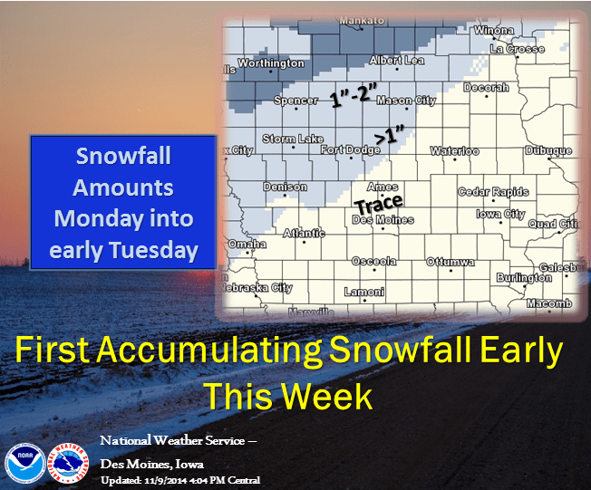 The National Weather Service is preparing for an early snowfall and bitterly cold temperatures in parts of the state. Roger Vachalek with the National Weather Service says the first measurable snowfall usually takes place after December 1st southeast of the Des Moines metro. The best chance for snow in Marion County is tonight, with little to no accumulation of snow is expected at this time. Overnight lows on Tuesday and Wednesday night in the area are expected to drop into the upper teens. Stay tuned to KNIA/KRLS for the latest winter weather information.