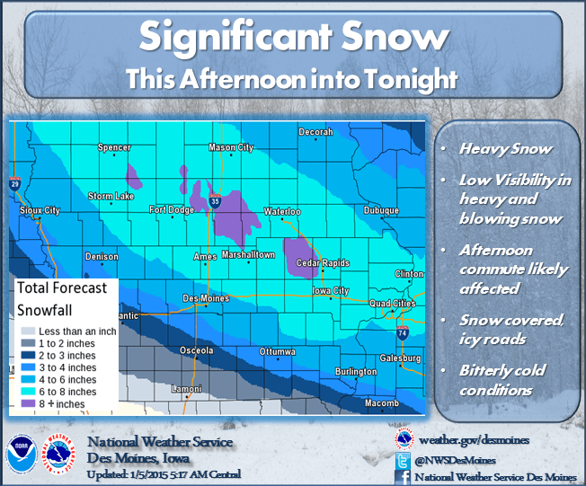 A Winter Storm Warning is in effect from 2 p.m. today until 3 a.m. Tuesday. Another storm system is expected to bring three to six inches of snow and blowing snow to south central Iowa starting in the afternoon and evening hours. The brunt of this system is expected to hit the northern half of the state, as those heading north of Interstate 80 could see totals exceed six to eight inches by Tuesday morning. Once snow leaves the area, near record-cold settles in, with overnight lows expected to dip well below zero and dangerous wind chills expected Tuesday and Wednesday night. Stay tuned to KNIA/KRLS for the latest cancellation and delay information and winter weather forecast.