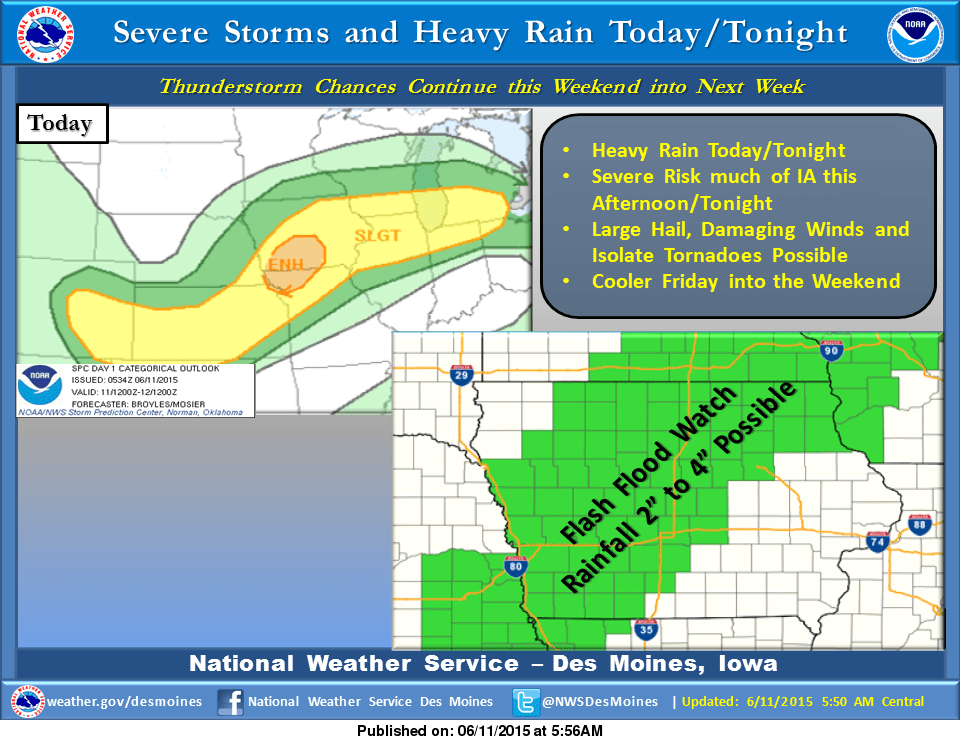 The National Weather Service Storm Prediction Center has issued an enhanced risk of severe thunderstorms, with hail and wind as the primary threats. The system also will likely bring the potential for localized flooding. According to the National Weather Service, one to two inches of rain is expected statewide by Friday morning, with higher amounts exceeding three inches possible, depending on the track of the storm. Stay tuned to KNIA/KRLS for the latest weather information.