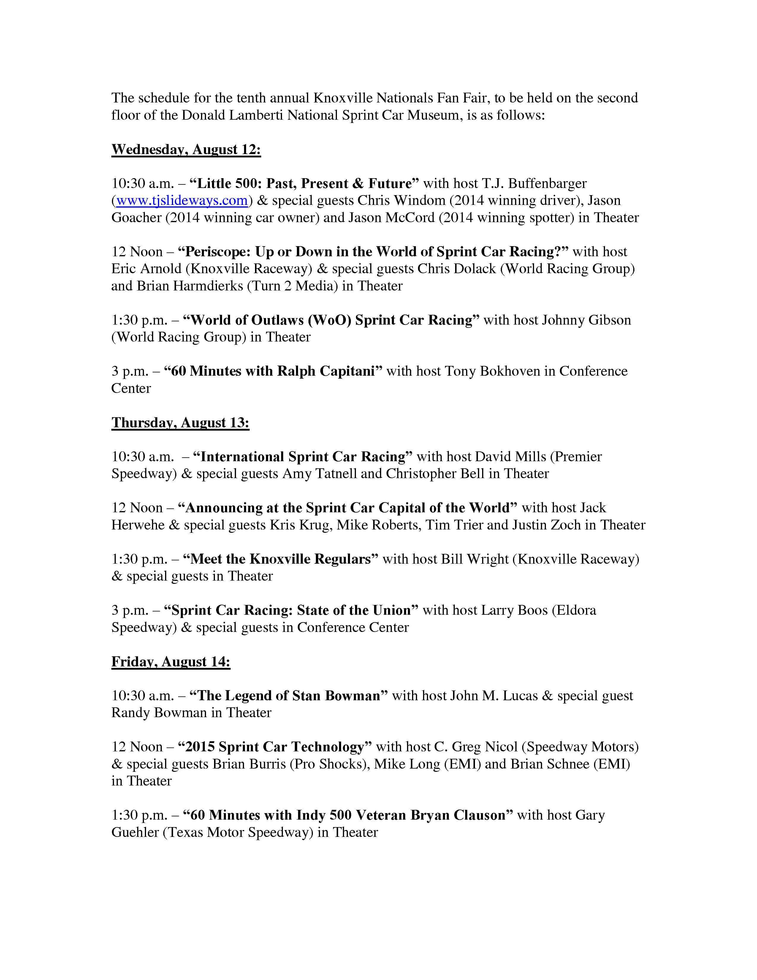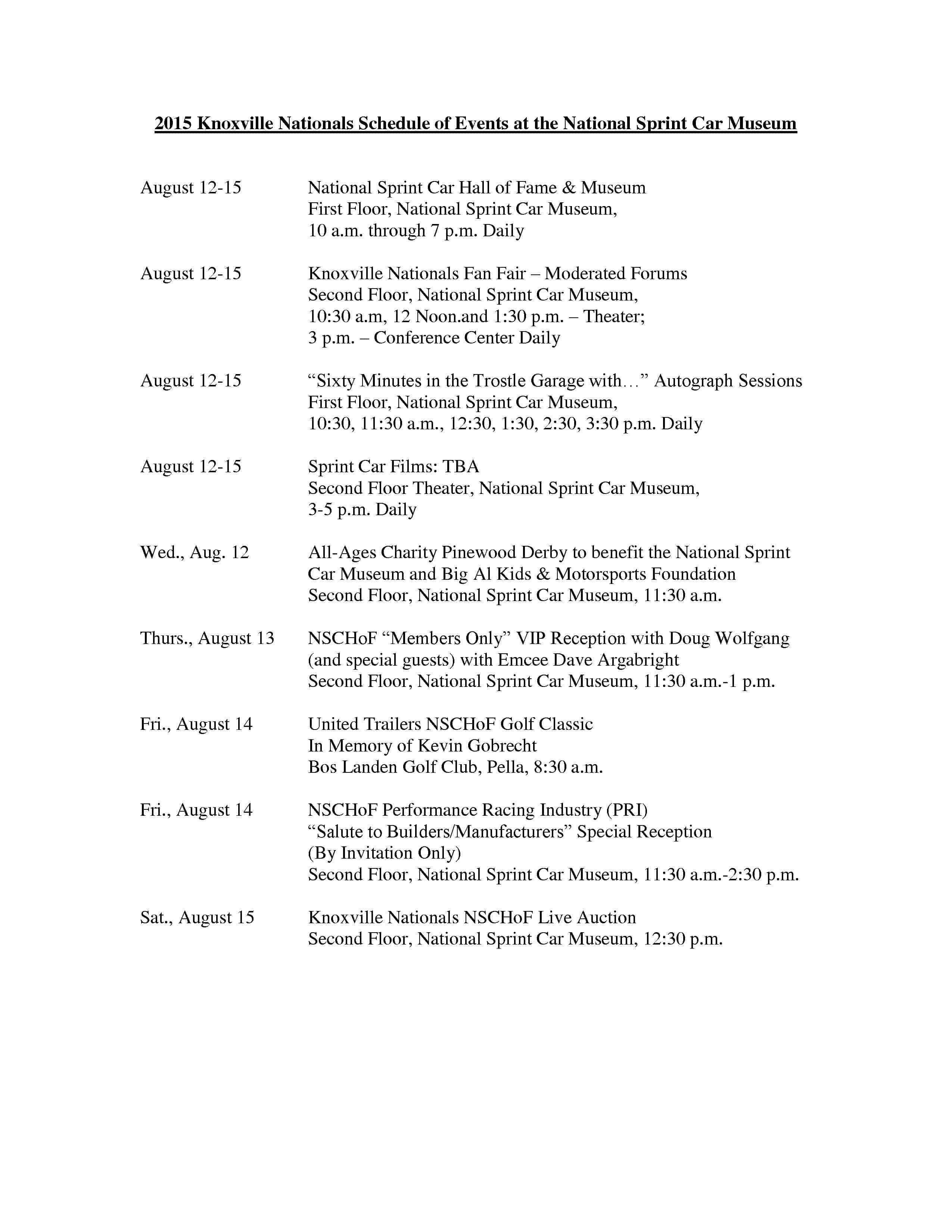 You can find out more about this week’s events at the National Sprint Car Hall of Fame and Museum on Let’s Talk Knoxville. A schedule of events is available below: