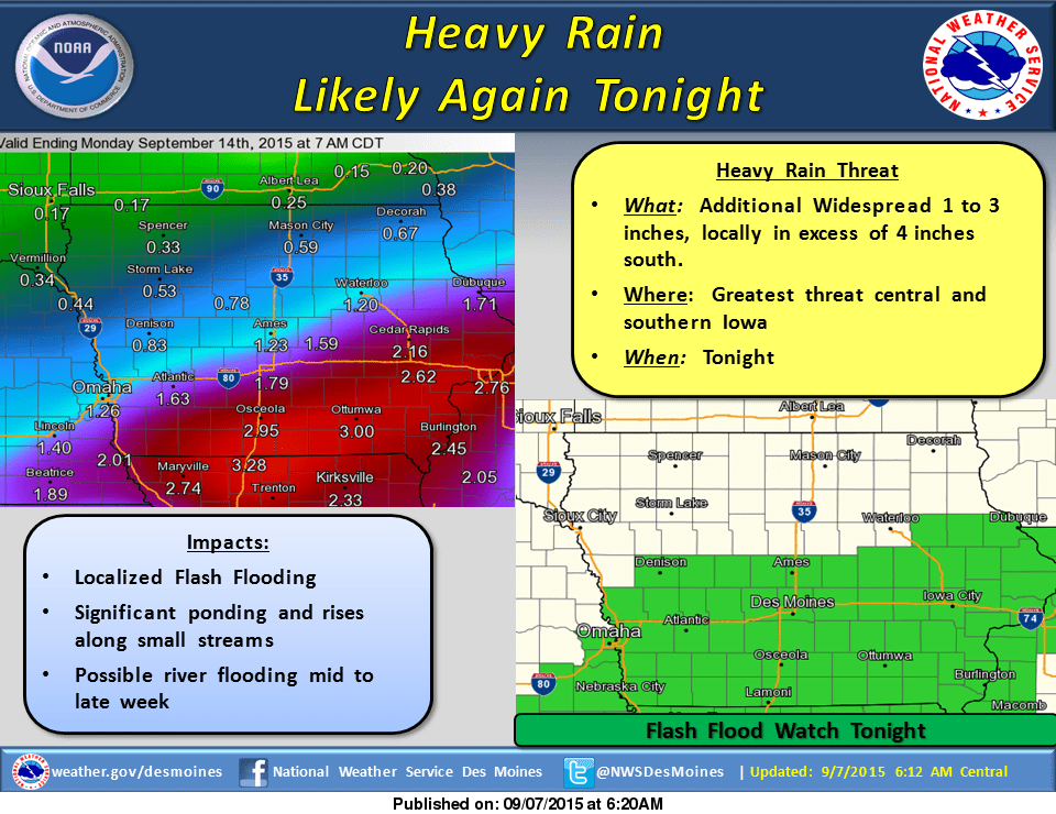 At our KNIA/KRLS Studios in Knoxville, 2.98 inches fell overnight Sunday. The National Weather Service has issued a flash flood watch through Tuesday morning. Another two to three inches of rain is expected in Marion County, with higher amounts possible depending on the track of the storm.