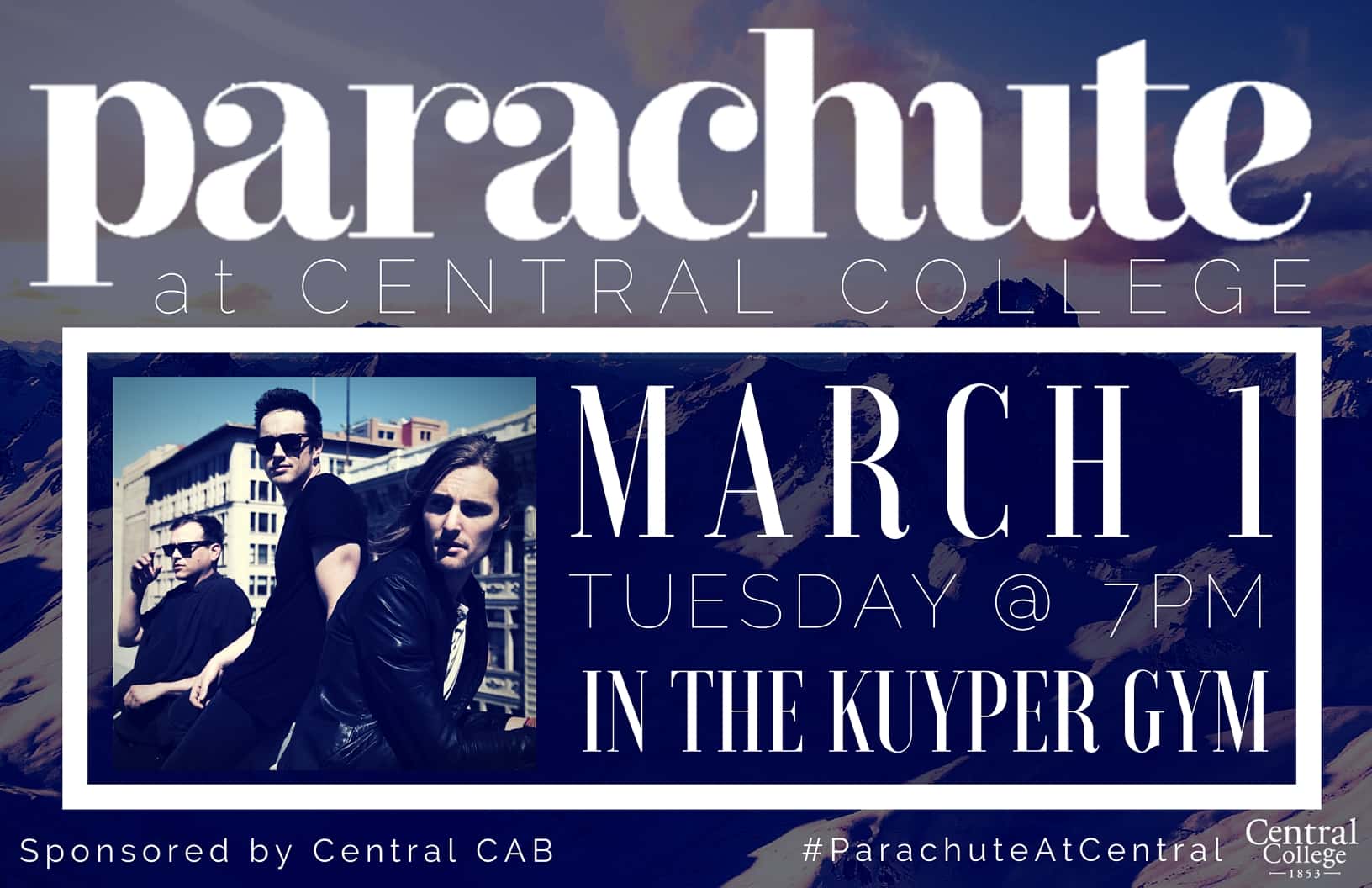 The pop rock band Parachute will be at Central College tonight to perform in the P.H. Kuyper Gymnasium.