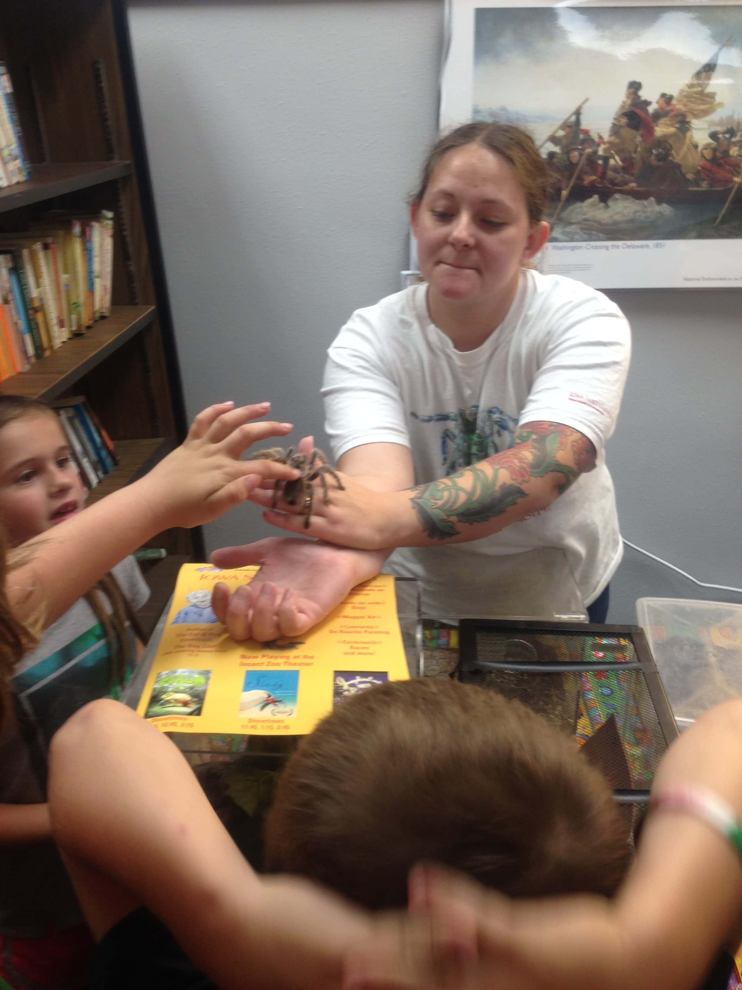 Children at the library program saw and learned about tarantulas, scorpions, cockroaches and centipedes. They did science experiments and learned facts about the creatures. The Summer Reading Program is free and continues with events throughout the summer.