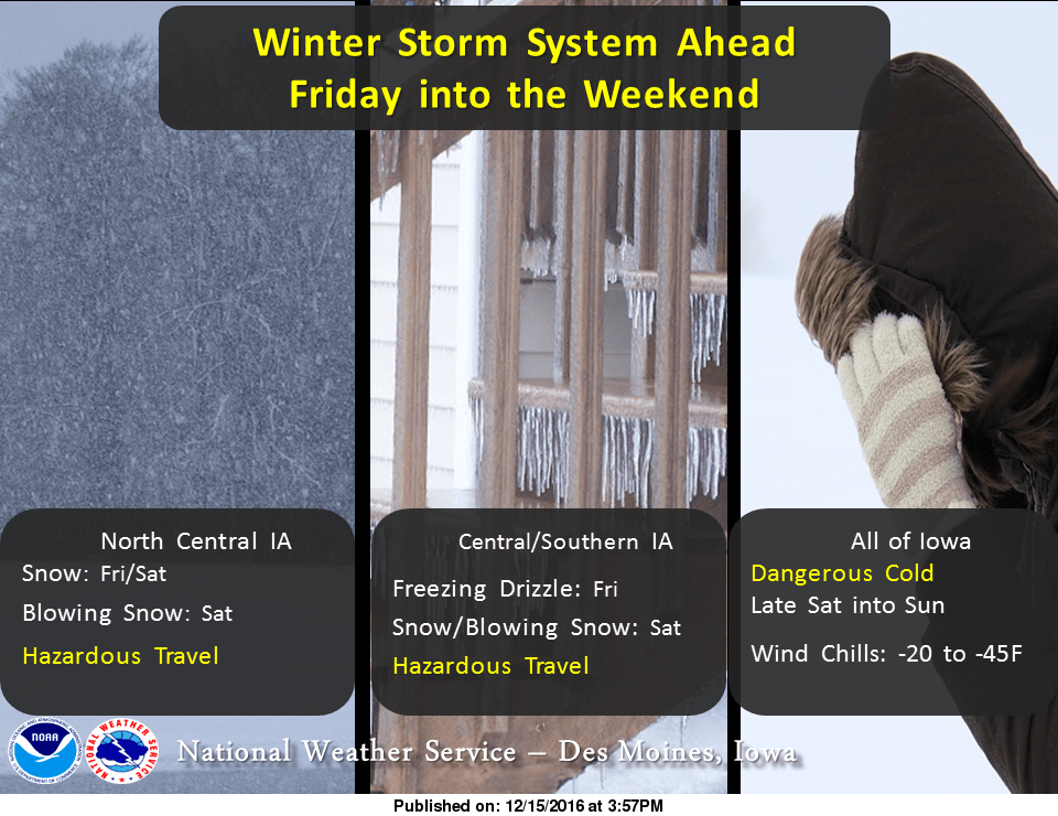 The advisory area includes Marion, Mahaska, Poweshiek, Jasper, Polk, Warren, Lucas, and Monroe Counties. Following the end of the advisory, temperatures will plummet, with overnight lows into Sunday Morning dropping well below zero, with wind chills bottoming out as low as 30 below zero.