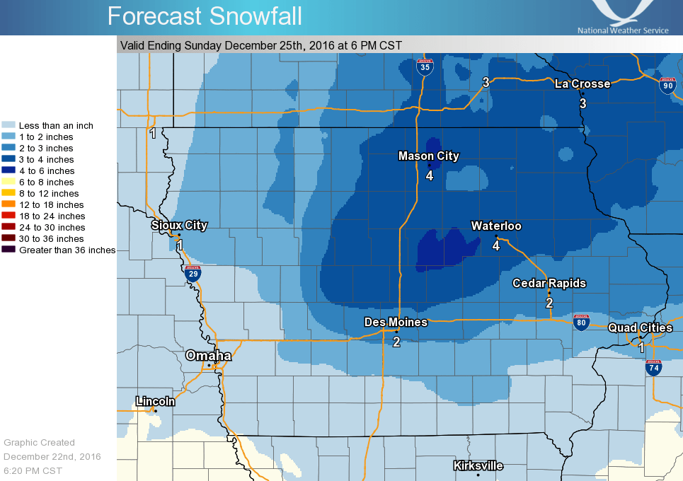 Most snow will be gone by Sunday, with temperatures in the low-to-mid 50s expected. The record high on December 25th in Marion County is 58 degrees set in 1960. Strong thunderstorms are possible, with rain expected much of the afternoon on Christmas Day. Stay tuned to KNIA/KRLS for the latest winter weather forecast.