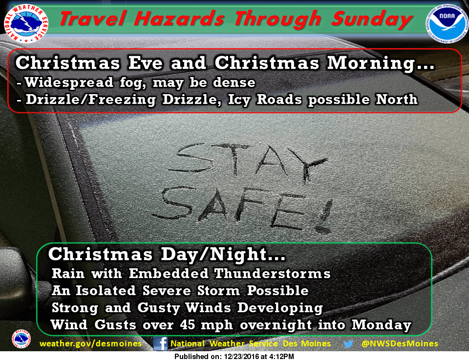 According to the National Weather Service, visibility may be lowered to less than a mile during those times. Showers and an isolated thunderstorm are possible on Christmas Day, with day-time highs in the mid-50s creeping near records.