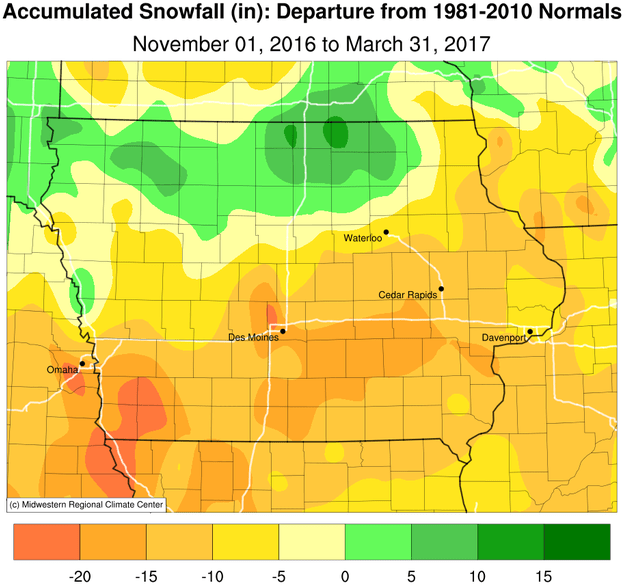 According to the National Weather Service, Marion County saw upwards of 15-20 inches of snow less than the seasonal average from November 1st through the end of March. Typically, south central Iowa sees 28-30 inches of snow annually.
