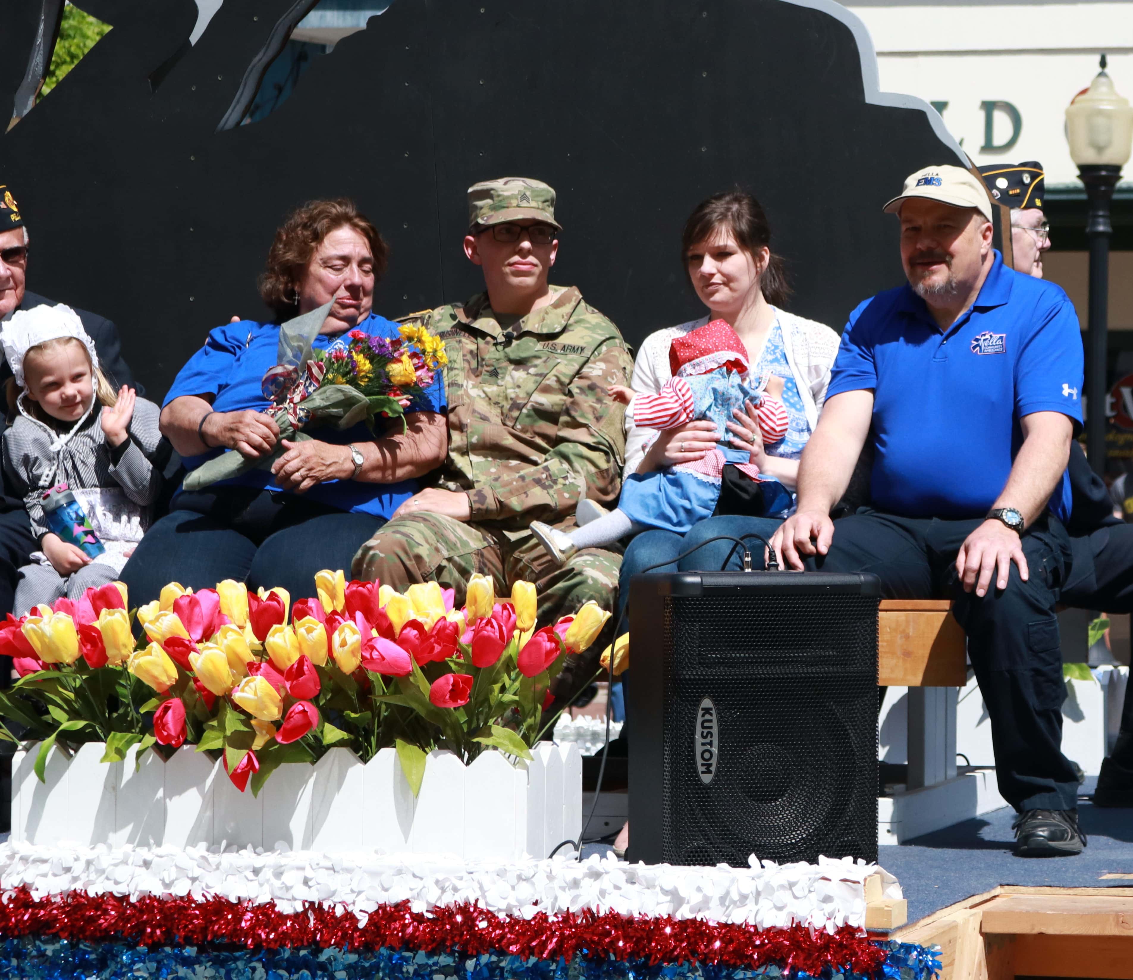 Sgt. Brian Bushnell of the U.S. Army his wife Tiffany, and daughter Emma surprised Brian’s parents Ruth and Michael during the afternoon Volks Parade Thursday.