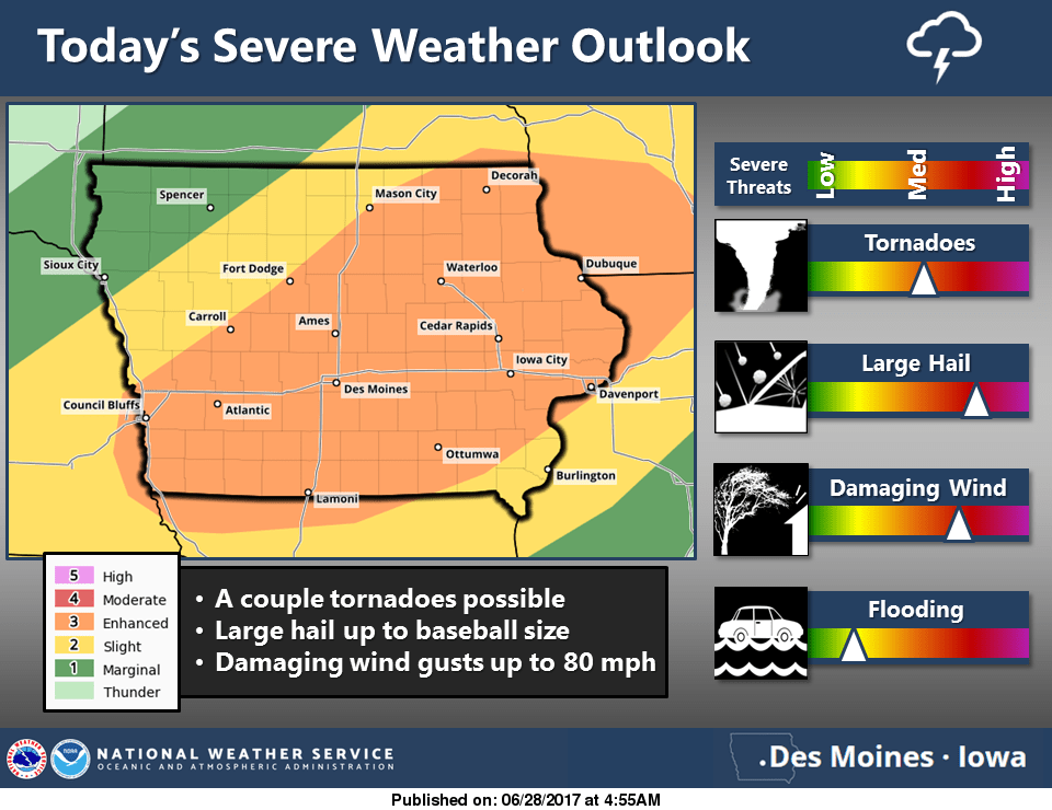 The National Weather Service Storm Prediction Center has issued an enhanced risk of severe storms from the afternoon through the late evening hours. The primary threats will be up-to-baseball sized hail and wind gusts in excess of 80 MPH, as well as the possibility of an isolated torando. A slight risk is also in place Thursday.