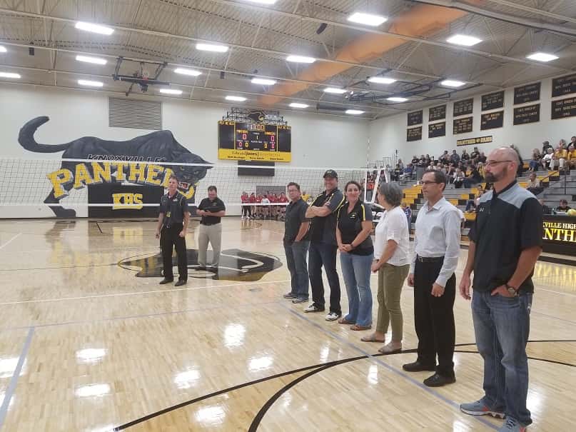 A ceremony was held just prior to the start of the varsity volleyball game in which the school gave thanks to everyone who contributed to the renovation. Knoxville High School Activities Directory Ryan Rump tells KNIA/KRLS News the gym floor was stripped and repainted for the first time in 20 years and the school added new scoreboards and a new panther mural. During the event the Knoxville Boosters gave away free popcorn and the Knoxville Alumni Association gave away free cookies and free t-shirts throughout the evening. The Knoxville High School Pep Band also performed. The KNIA/KRLS Big Red Radio was on hand playing music and making announcements.