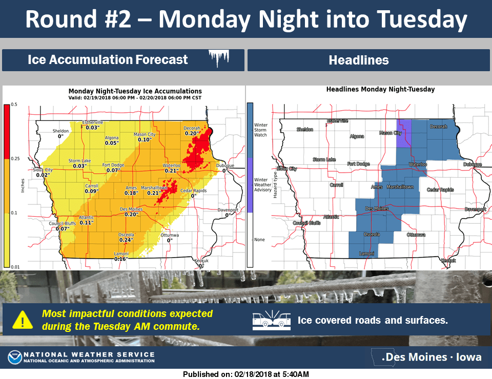 A round of freezing rain may coat the area with ice overnight President’s Day into Tuesday morning.