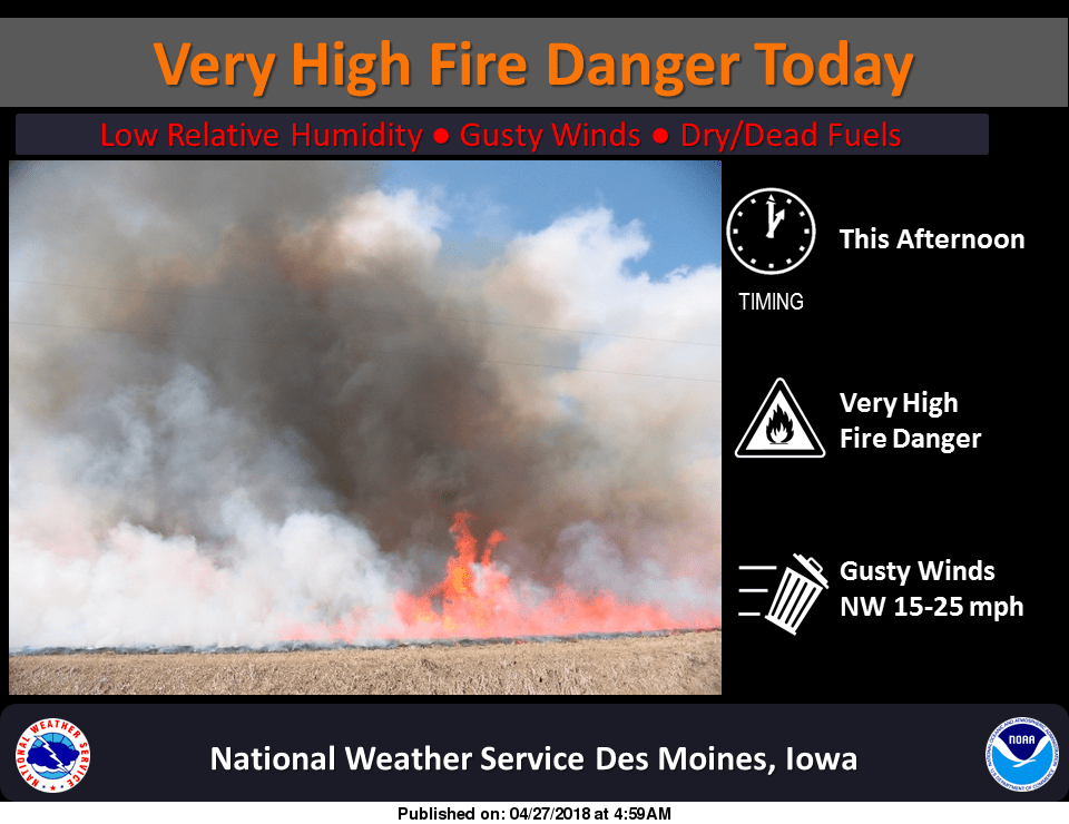 Extreme fire conditions are expected through the warning, as winds between 25 and 30 mph–with gusts up to 40 mph, coupled with relative humidity at 15 to 25 percent and very dry grass conditions are in place.