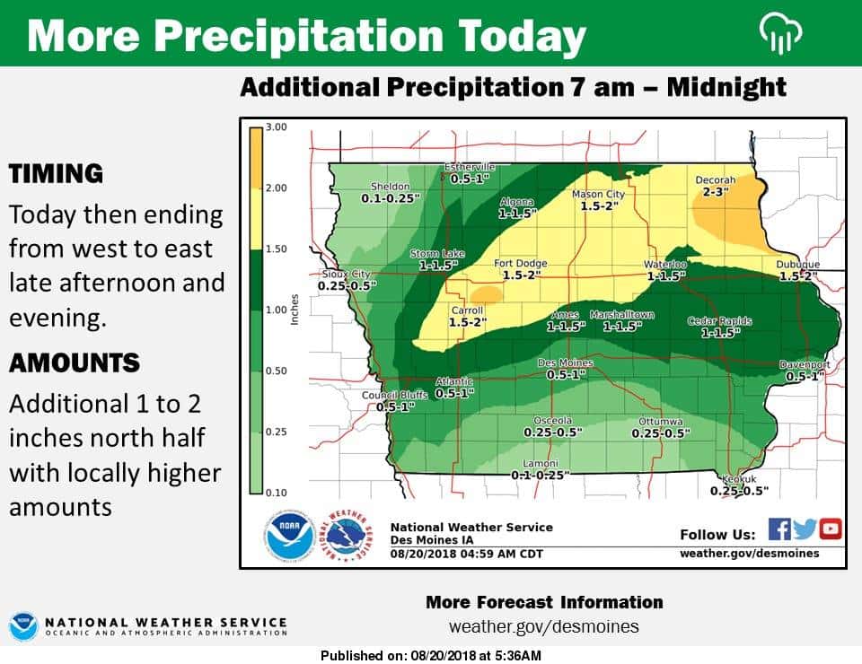 According to the National Weather Service, a total of 1-3” of precipitation is possible throughout most of Iowa, with the heaviest amounts expected today along and north of I-80. Light rain is more likely to fall in south central Iowa.