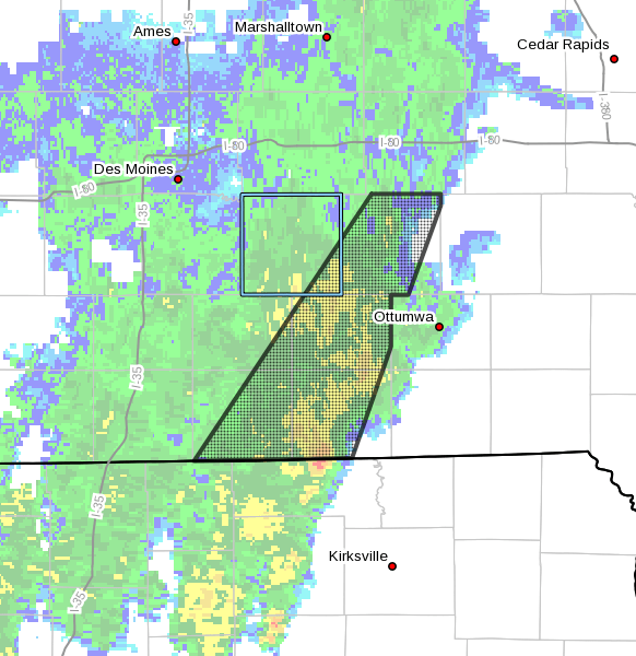 Monroe, Southeastern Lucas, and Mahaska Counties are also included in the warning. Radar estimates show that one to three inches of rain fell in the warned area overnight, with more coming today. Since Sunday morning, 1.53″ of rain has fallen at Cedar Creek near Bussey, and 5.28 inches since Thursday evening.