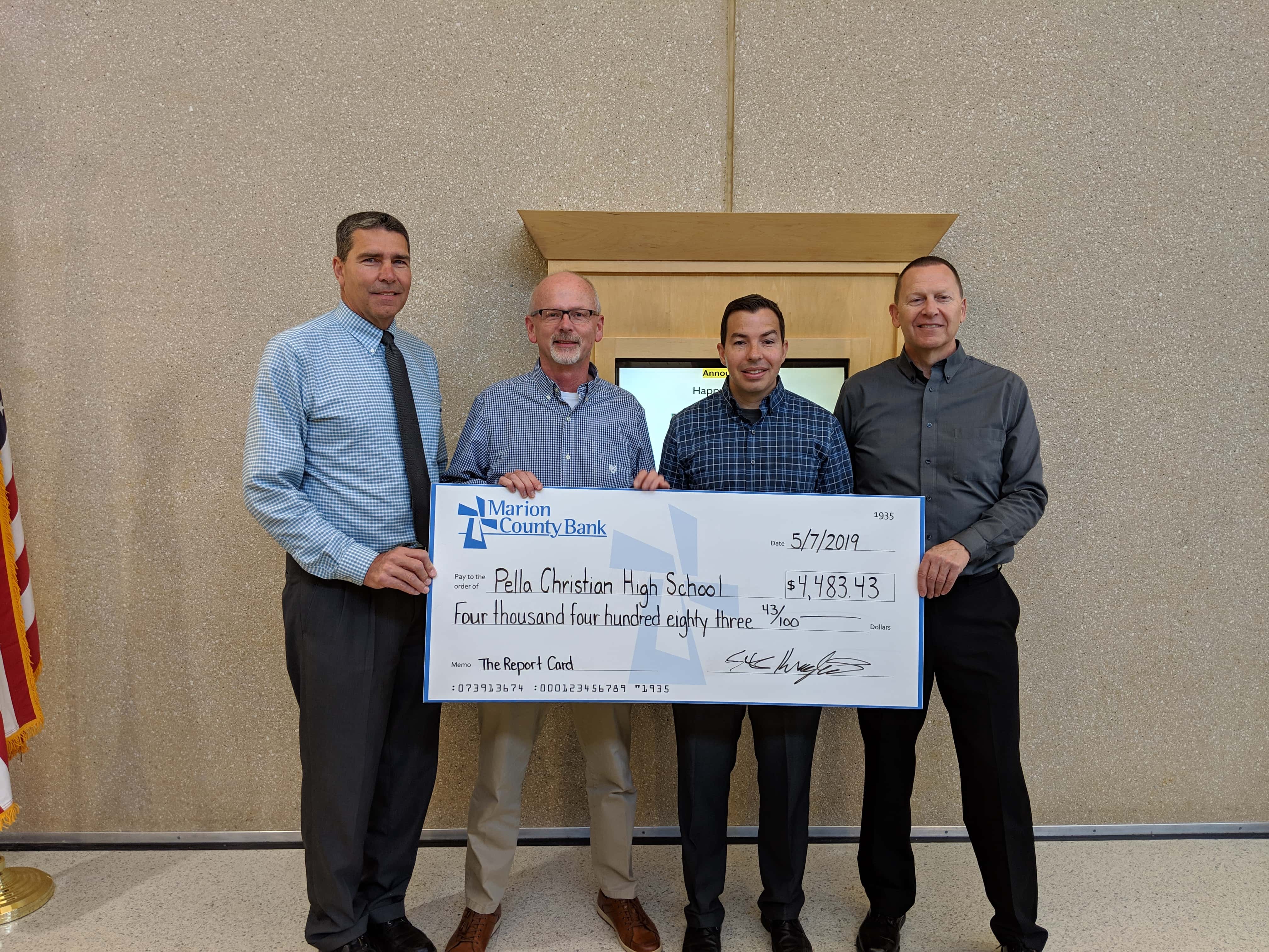 Several local schools received a boost as part of a program at Marion County Bank. More than $25,000 was given to Pella and Pella Christian schools as part of the Report Card Debit Card Rewards Program. Marion County Bank launched the initiative in 2007 and has donated nearly $194,000 to local schools since it started. Report Card allows the bank’s debit card customers to support one of 13 local schools, and with each purchase, Marion County Bank makes a donation to the school of their choice. Enrollment in Marion County Bank’s Report Card is free and there’s no limit to the money a school can earn.
