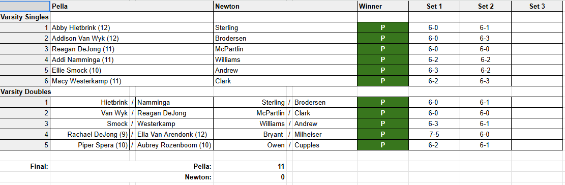 The #3 in 1A Pella girls tennis team kept things rolling with an 11-0 sweep of Newton at home on Thursday. It completes a stretch of six meets in eight days for the green and white. Hear from Coach Bouska this Saturday on the Hy-Vee Radio Coaches Corner and from Addi Namminga and Abby Hietbrink on Monday’s edition of “Today’s Lely Radio Sports Page.” The Dutch are back on the courts on Wednesday at Norwalk.