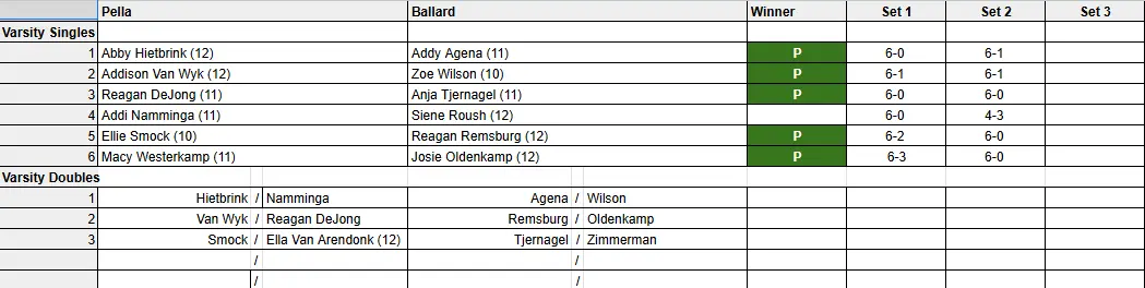 Pella will compete this week at the state singles and doubles tournament in Iowa City on Wednesday, before hosting the state team tournament on October 6 and 7. Hietbrink/Addi Namminga and DeJong/Van Wyk will be the duos for the Dutch in the doubles bracket.