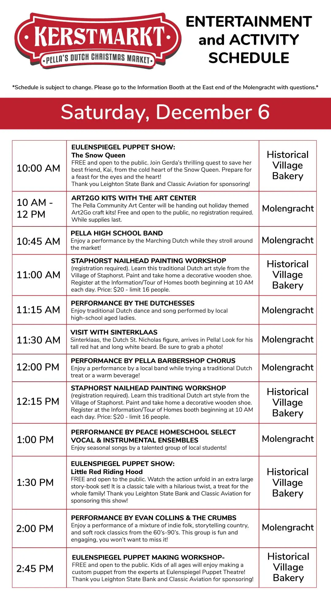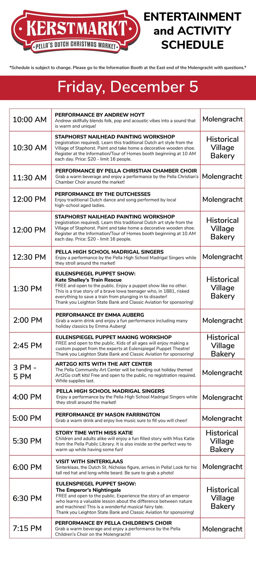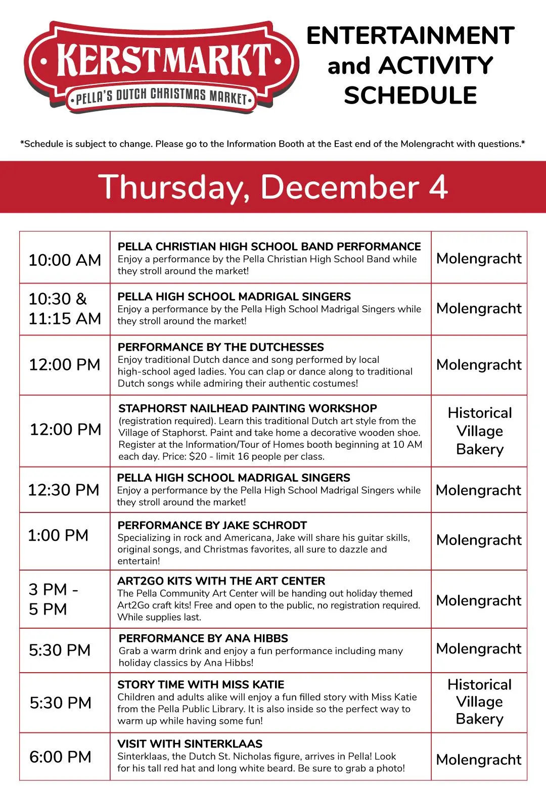 The Pella community is celebrating the holiday season with the fifth annual Kerstmarkt Dutch Christmas market later this week. The three-day event December 4th through the 6th will be held on the Molengracht canal, with a wide range of activities scheduled. Entertainment includes performances by Pella and Pella Christian students, the Dutchesses group from Tulip Time, and various other performers from 11 a.m. to 7 p.m. each day. Find more information about the Kerstmarkt Dutch Christmas market here.