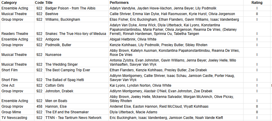 Pella Christian had nine of ten acts earn “I” scores as well, including:
