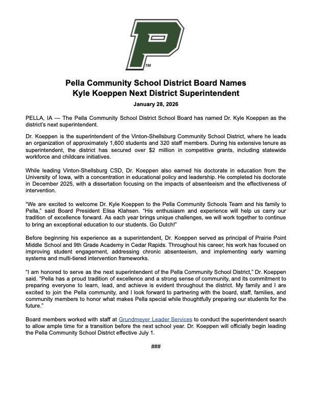 “We are excited to welcome Dr. Kyle Koeppen to the Pella Community Schools Team and his family in Pella,” School Board President Elisa Klahsen said in a statement.