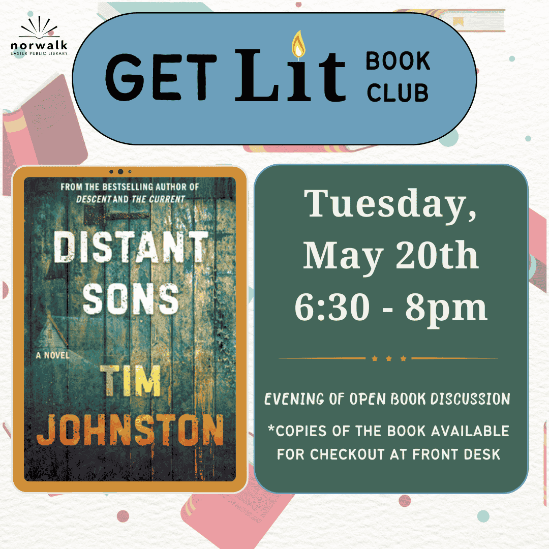 The Norwalk Easter Public Library invites you to a book club on Tuesday May 20th at 6:30pm. All readers are welcome for open discussion of “Distant Sons” by Tim Johnston, the 2025 All Iowa Reads-Adult selection. Copies of the book are available for checkout at the front desk.