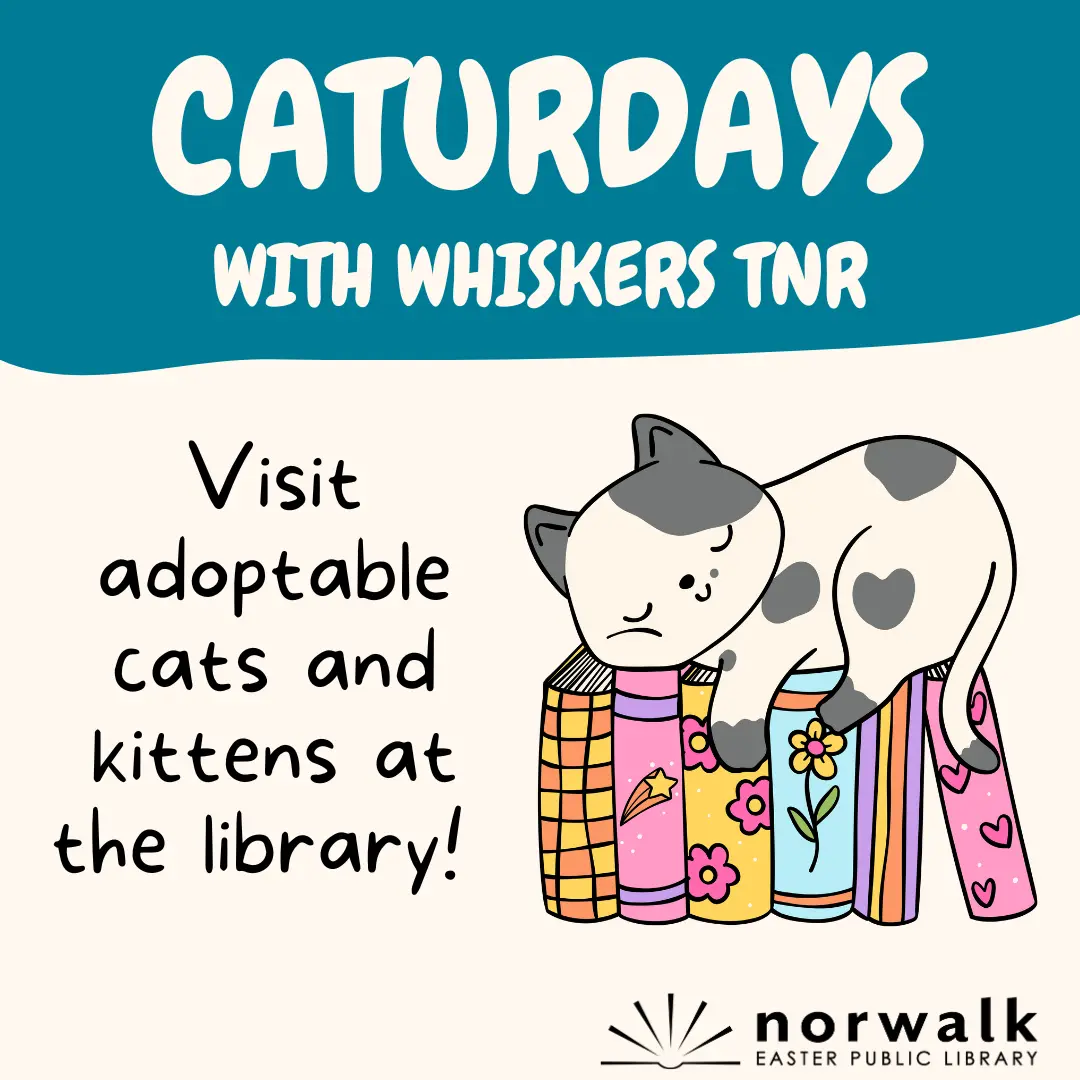 Join the Norwalk Easter Public Library for Caturday on Saturday October 11th from 10:00am-noon with Whiskers TNR. Visit with adoptable cats and kittens. Whiskers TNR volunteers will answer your questions about adoptions and the TNR program.