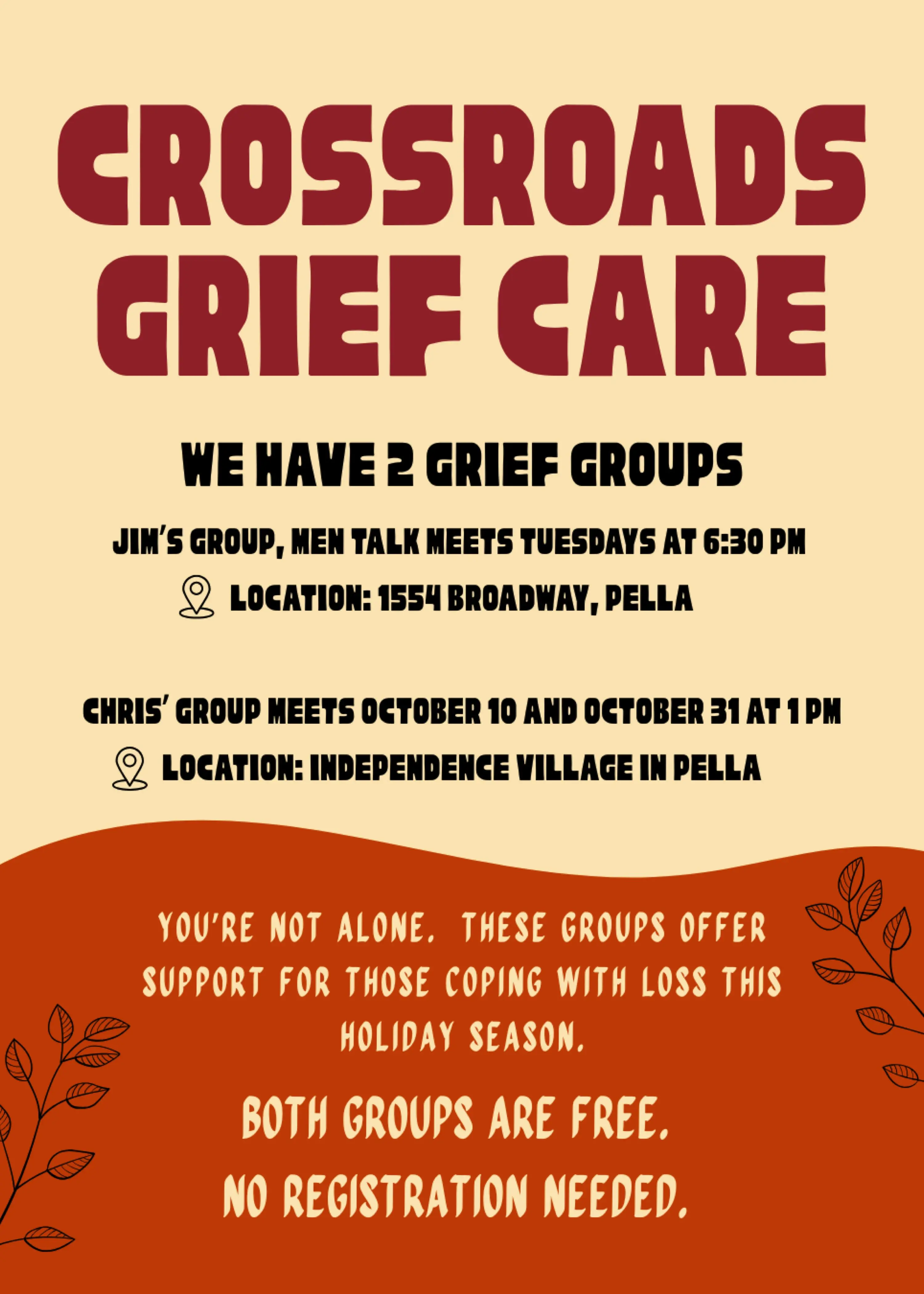 Crossroads of Pella will hold a grief support group on Tuesdays at 1554 Broadway in Pella. The group meets Tuesday at 6:30pm and is free and no registration is needed. This group supports those that have or are experiencing loss.