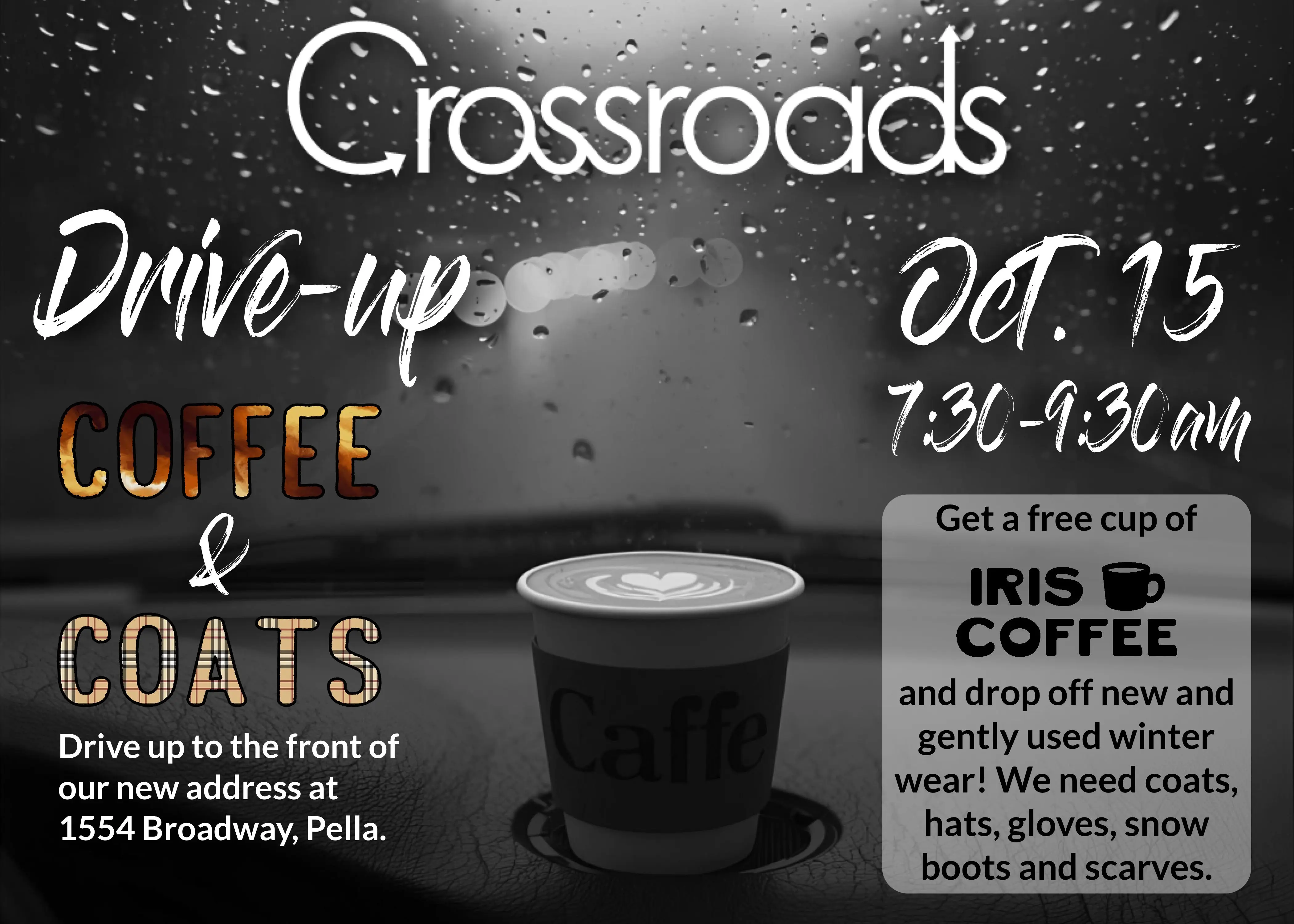 Crossroads of Pella is hold a Drive Up Coffee and Coats event on Wednesday October 15th from 7:30-9:30am at the new address 1554 Broadway in Pella. Get a free cup of Iris Coffee and drop off a new or gently used winter coat. They are currently in need of coats, hats, gloves, boots and scarves.