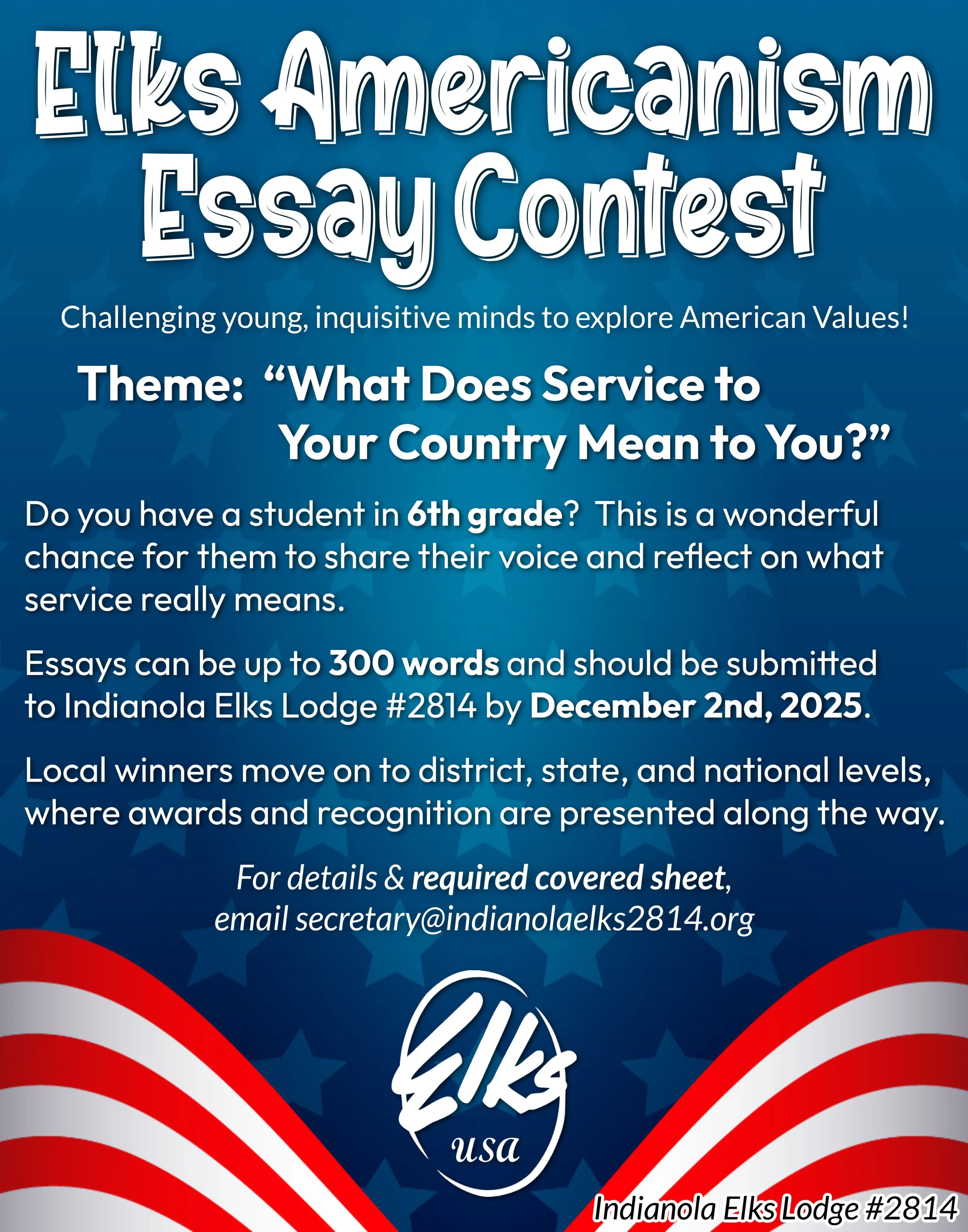 This year’s theme is “What Does Service to Your Country Mean to You?” The essay is Open to 6th-grade students, with essays due to the Indianola Elks Lodge #2814 by December 2nd. Winners advance to district, state, and national levels for recognition. For more information email secretary@indianolaelks2814.org.