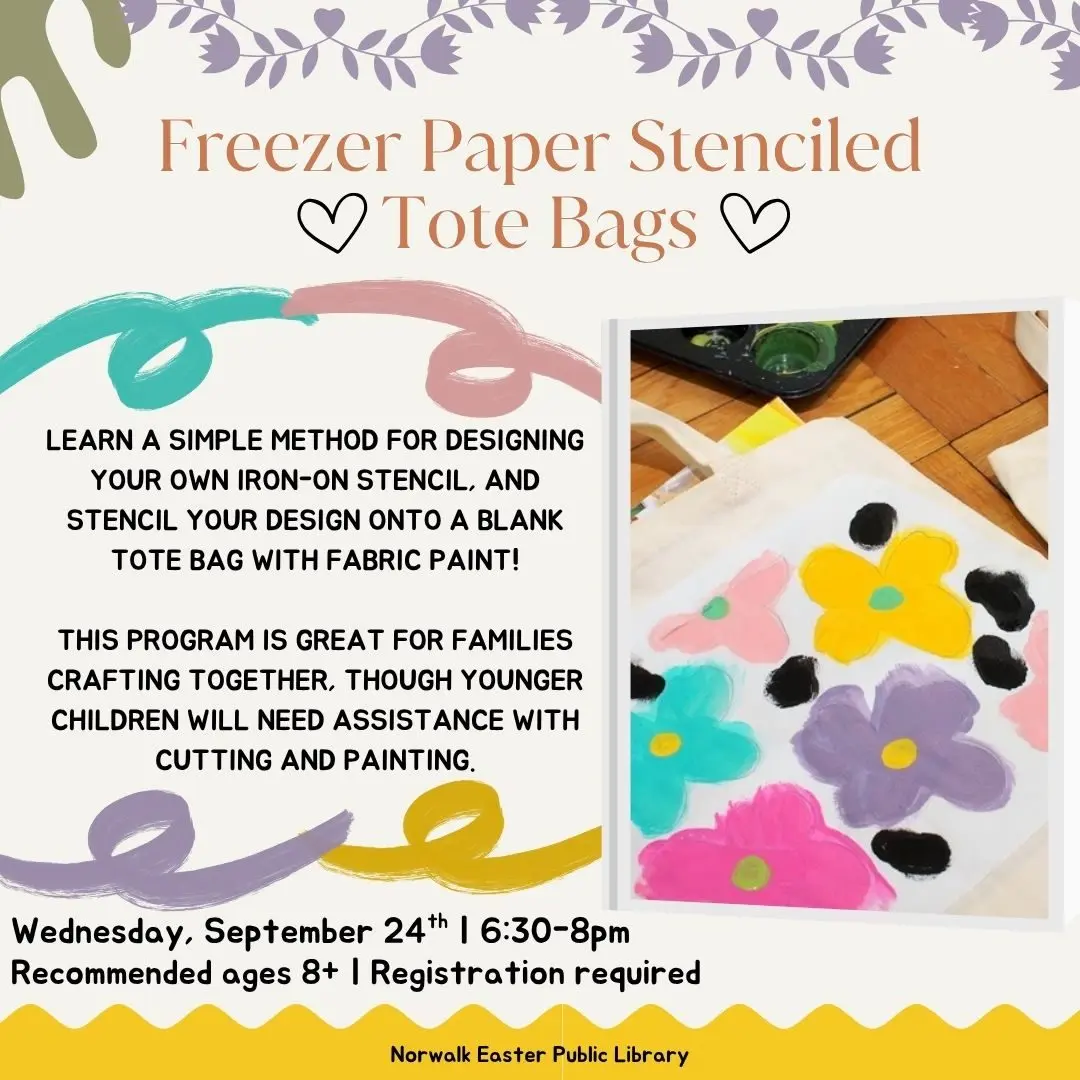 The Norwalk Easter Public Library will hold a Freezer Paper Stencils class on Wednesday September 24th at 6:30pm. Learn a simple method for designing your own iron-on stencil, and stencil your design onto a blank tote bag with fabric paint. Each registered attendee will receive one blank tote bag to stencil. Register at norwalklibrary.org.