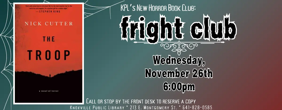 A new Knoxville Library club call Fright Club will meet on Wednesday November 26th at 6:00pm. It is a horror book club and the selection will be “The Troop” by Nick Cutter. Call 828-0585 or stop by the front desk to reserve at copy.