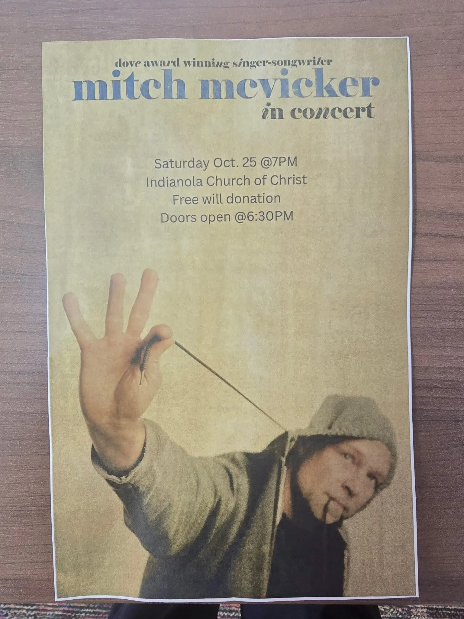 The Indianola Church of Christ is welcoming Dove Award Winning Singer-Songwriter Mitch McVicker in concert on Saturday October 25th at 7:00pm. The public is invited to this event. Cost is a freewill donation. Doors will open at 6:00pm.