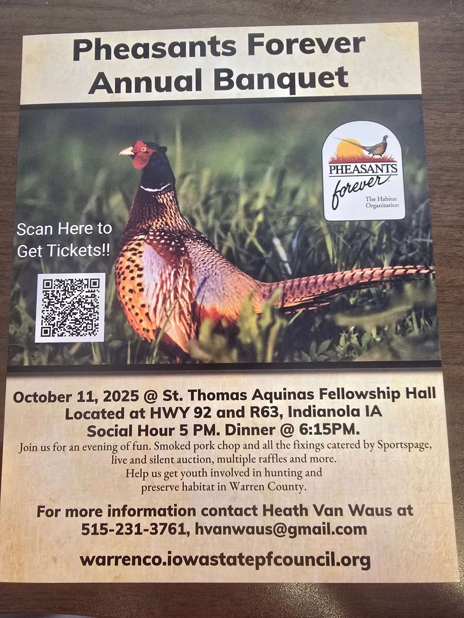 There will be a Pheasants Forever Banquet on Saturday October 11th at St. Thomas Aquinas Fellowship Hall in Indianola. Social hour will be at 5:00 with dinner at 6:15pm. There will be a live and silent auction. For more information call 515-231-3761.