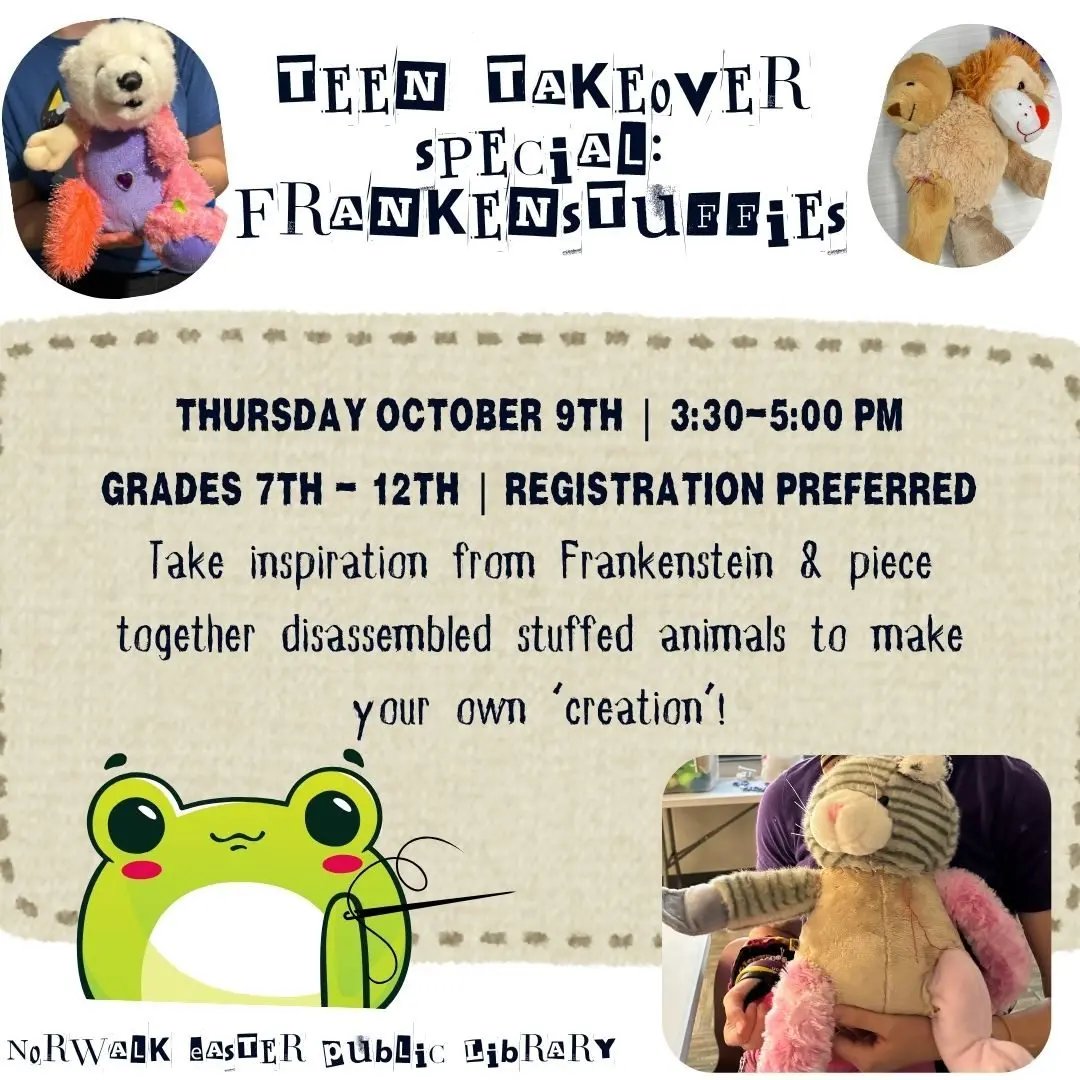 The Norwalk Easter Public Library will hold a Teen Takeover making Frankenstuffies on Thursday October 9th from 3:30-5:00pm. Taking inspiration from Frankenstein, you’ll piece together disassembled stuffed animals to make our own creations. All materials are provided. This event is for Grades 7th-12th. Registration strongly preferred at norwalklibrary.org.