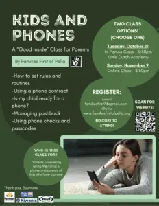 Families First of Pella will hold a Kids and Phones Class for parents on Sunday November 9th at 8:30pm. This online class will teach parents how to set rules and routines, using a phone contract, is your child ready for a phone, managing pushback and using phone checks and passwords. This is a free class and email familiesfirst94@gmail.com to register or for more information.