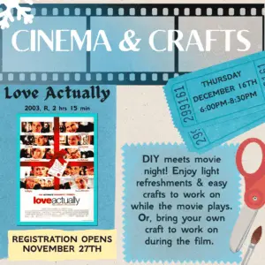 The Norwalk Easter Public Library will hold Cinema and Crafts with the movie “Love Actually” on Thursday December 18th at 6:00pm. Enjoy light refreshments and easy crafts to work on while the movie plays.