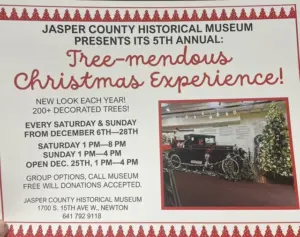 The Jasper County Historical Museum will hold it Tremendous Christmas now through December 28th at the Jasper County Historical Museum. It’s every Saturday from 1:00-8:00pm and Sunday Sunday from 1:00-4:00pm, and also open Christmas Day from 1:00-4:00pm. For more information call 792-9118.