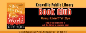 The Knoxville Library will hold a book club on Monday October 13th at 1:30pm. The book discussed will be “A Boy And His Dog At The End Of The World” by C.A. Fletcher. Copies of the book will be available for check out.