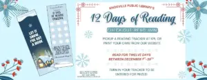 The Knoxville Library will hold a reading in December called the 12 Days of Reading. Pick up a reading tracker from the library or print one off from the website at knoxville.lib.ia.us. Read for 12 days from December 1st-25th and then turn in your tracker for a chance to win prizes. For more information call 828-0585.